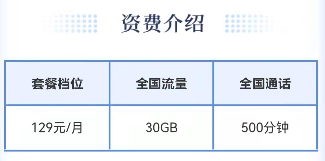 最关键是最低档129元的月套餐,流量是30GB,通话时间为500分钟。