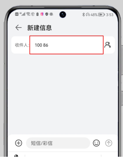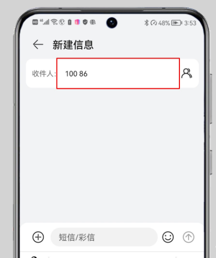 3、进入“新建信息”窗口后,在“收件人”文本框中输入“10086”。