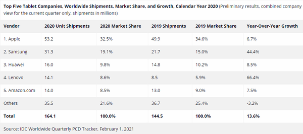 IDC最新发布的数据显示,2020年第四季度,全球平板电脑出货量达到5220万台,同比增长19.5%,这是2017年以来出货量最高的“第四季度”。纵观2020年全年,全球平板电脑出货量为1.641亿台,同比增长13.6%。
