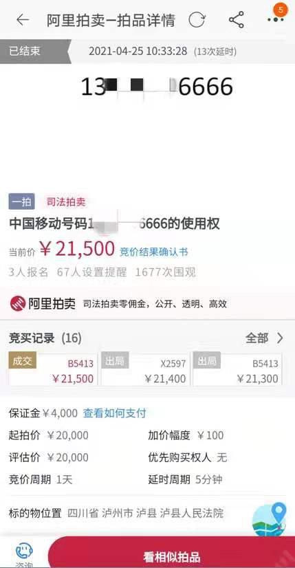 2021年4月,泸县法院以20000元底价在淘宝网公开司法拍卖被执行人尾号为“6666”的手机号码,67人设置提醒,吸引1737次围观。