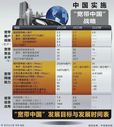 根据当时的“宽带中国”战略目标,到2020年,固定宽带家庭普及率达到70%,行政村通宽带比例超过98%,城市和农村家庭宽带接入能力分别达到50Mbps和12Mbps,发达城市部分家庭用户可达1Gbps(即千兆水平)。
