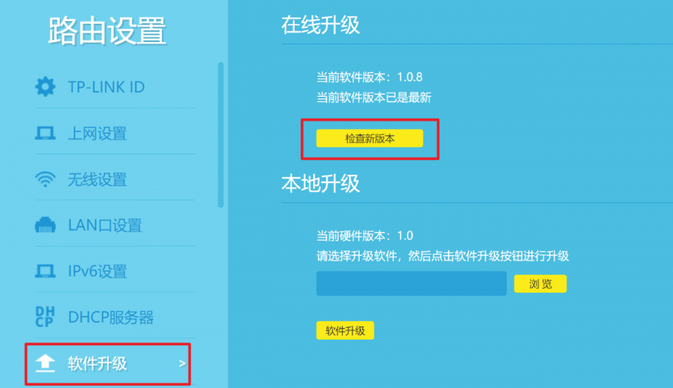 如果你的路由器是刚上市就买的头几批,固件版本会比较老旧,更新一下才能释放全部性能,甚至还有新功能,新界面。这里以比较常见的 TP-LINK 为例。在路由器后台,点击软件升级–检查新版本,然后升级即可。